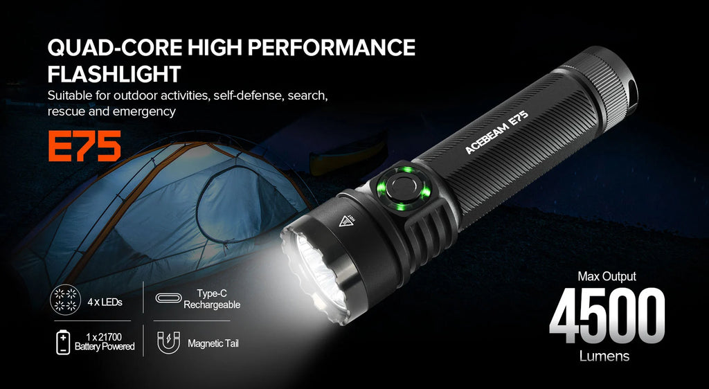 A powerful new flashlight from Acebeam, the E75 combines a small compact body, with a high performance Quad LEDs, with custom reflector to give unrivalled output, yet remains well suited to EDC thanks to the modest size.
