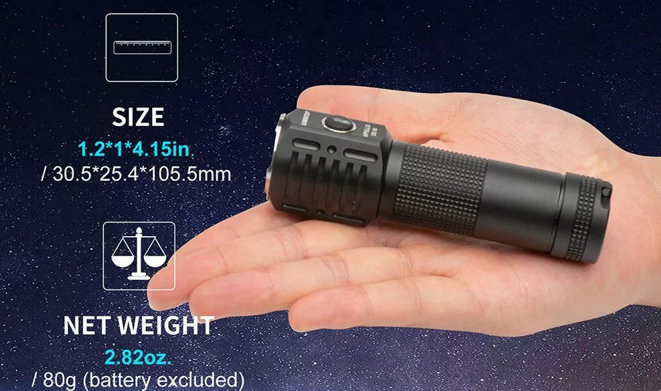 A high quality heat treated aluminum body is rated to IP68 (2 metres submersion), drop tested to 1.5 metres. The size is 105.5mm x 30.5mm x 25.4mm, and a weight of just 80g (no battery).