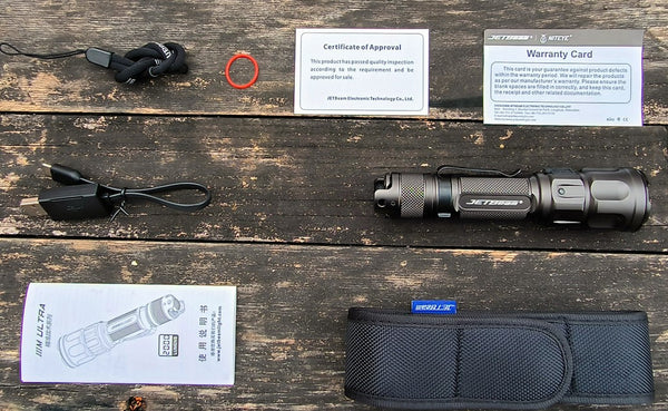 All configurations of the flashlight: a JETBeam III M flashlight, including a 3500mAh 18650 battery, a USB charging and discharging cable, a manual, warranty card and certificate, sealing rubber ring, hand rope and flashlight cover.