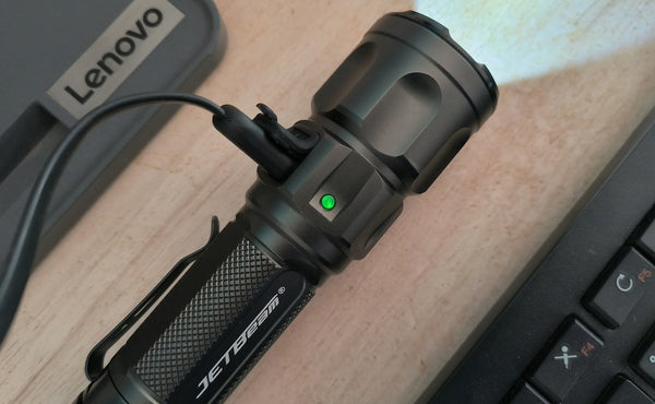 The flashlight is equipped with a TYPE-C charging port. The red indicator light lights up during charging and the green light switches to full charge. Maximum charge current 1.8 A. The flashlight can be used during charging.