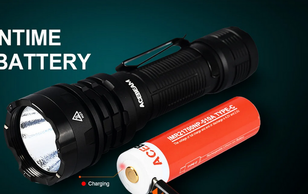 Powered by an Acebeam 21700 lithium ion rechargeable battery, with a long lasting capacity of 5100mAh, allowing the P17 to have a max runtime of 22 days at ultra low mode. The battery also has a USB-C port integrated, to allow quick and practical charging. No more having to bring a separate charger, or a special cable to recharge your light, thanks to the P17 you can take advantage of any of the USB-C cables to charge your battery, at any time, so you and your light will always be ready for the darkness.