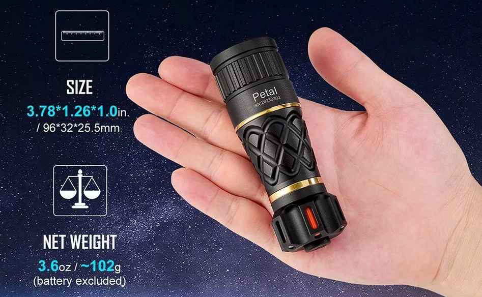 By using a LEP and LED combined in a single body, the Petal becomes more versatile than many flashlights. The LEP (laser excited phosphor) can reach impressive ranges thanks the concentrated output which is quite different to a normal LED flashlight.