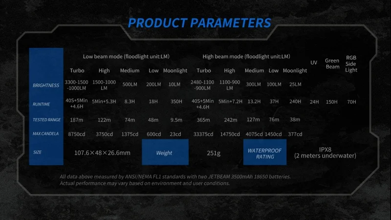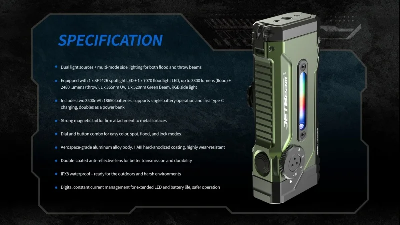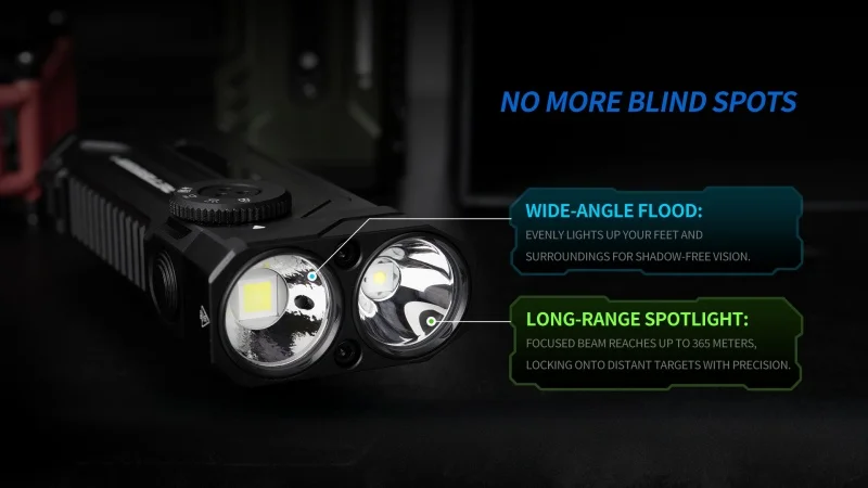 - Maximum Throw Distance: Floodlight mode 187 meters; Spotlight mode 365 meters