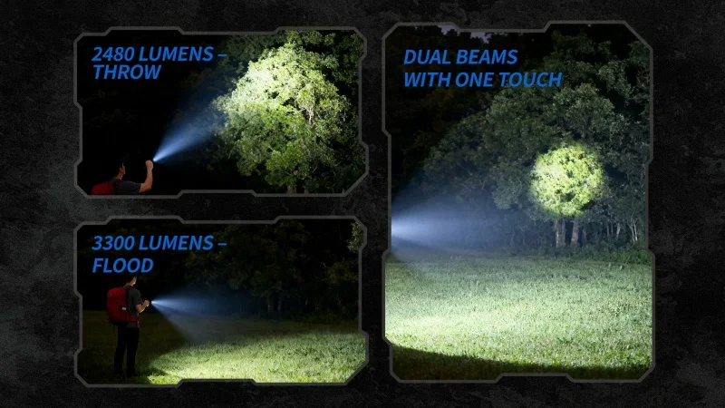 - Maximum Output: Floodlight mode 3300 lumens; Spotlight mode 2480 lumens