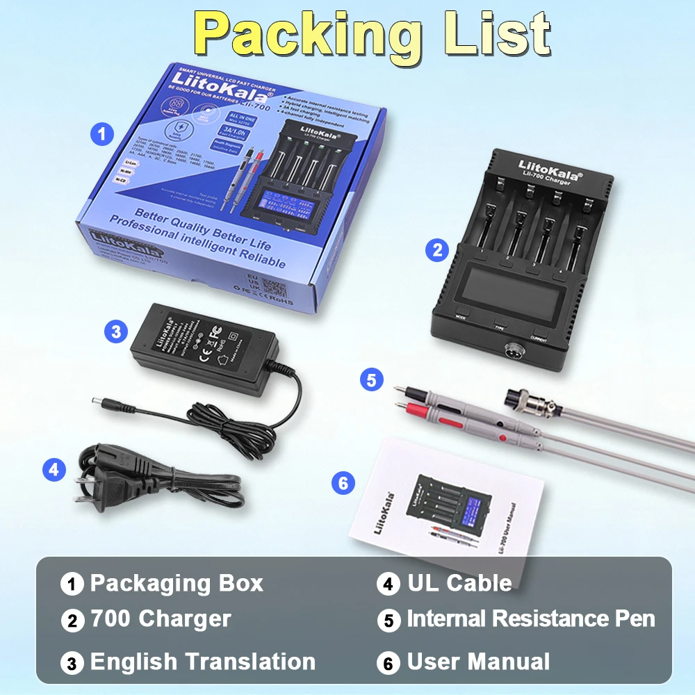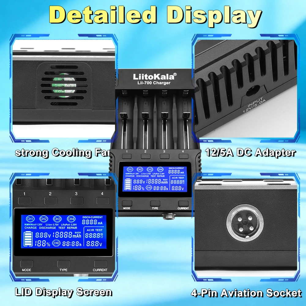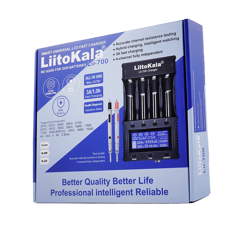The Lii-700 is a high-end, intelligent, fast charger featuring functions such as battery internal resistance testing, 4 independent charging channels, battery capacity detection, reverse connection protection, short-circuit protection, overcharge protection, and 0V battery activation. It automatically and timely monitors the battery charging, discharging, and testing processes.