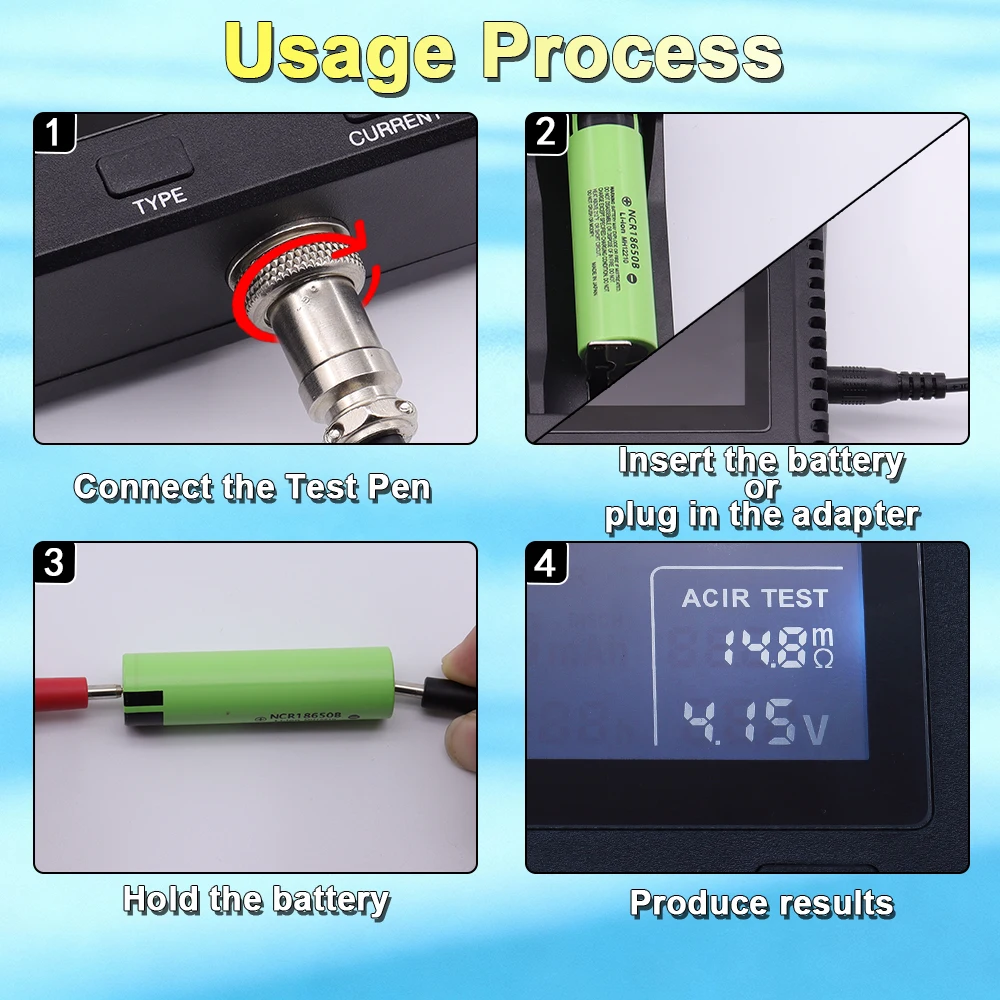 5.1 Use the included aviation connector test leads. Press them against the positive and negative poles of the battery for about 3 seconds to accurately detect the battery voltage and internal resistance value.