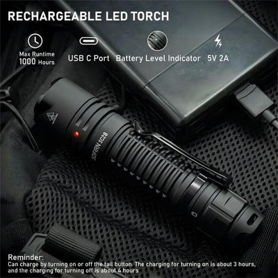 Die Taschenlampe ist mit einem Typ-C-Ladeanschluss ausgestattet, der bequemes und problemloses Laden ermöglicht. LED-Anzeigen ermöglichen die Echtzeitüberwachung des Ladevorgangs und des Akkustands. Während des Ladevorgangs leuchten die Anzeigen rot und wechseln bei voller Ladung auf grün. Sinkt der Akkustand unter 25 %, blinkt die LED zusätzlich rot und erinnert Sie so an das Aufladen. Dank des Typ-C-Anschlusses und der intuitiven Statusleuchten wird das Aufladen Ihrer SC28 zu einer einfachen und unkomplizierten Aufgabe.