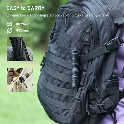 Die SC28 wurde mit größter Sorgfalt und höchster Langlebigkeit gefertigt und verfügt über eine hochtransparente Linse und ein Gehäuse aus Aluminiumlegierung in Flugzeugqualität. Diese Kombination bietet nicht nur hervorragende Stoß- und Kratzfestigkeit, sondern sorgt auch für ein leichtes und tragbares Design. Mit Abmessungen von nur 129 mm Länge und 29 mm Durchmesser ist die SC28 die ideale Taschenlampe für den täglichen Gebrauch, die den Strapazen verschiedener Abenteuer standhält, ohne Sie mit zusätzlichem Gewicht zu belasten.