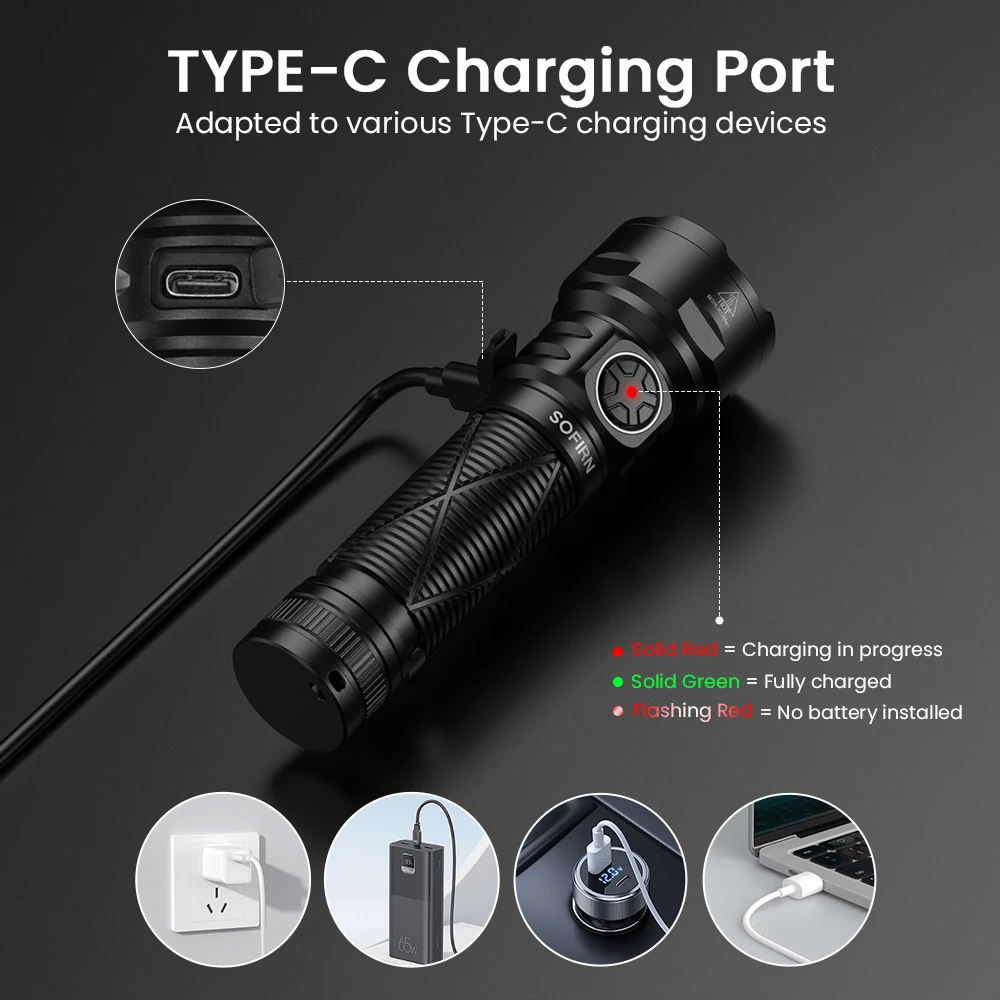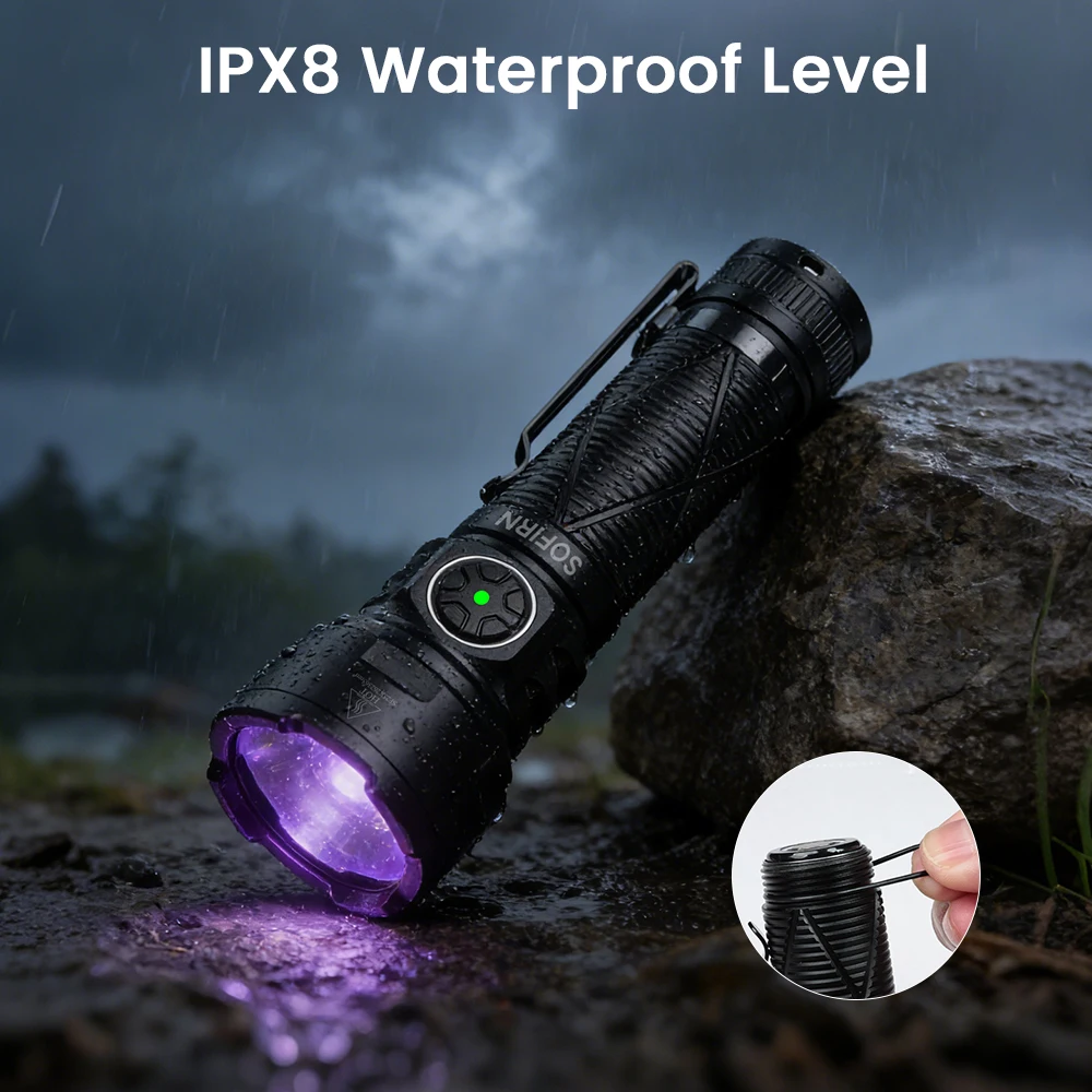 Sofirn SR15UV is a rugged 365nm 1000lm UV flashlight delivering 12W of power. It runs on a high-capacity 5000mAh (21700) battery and features IPX8 waterproofing and anti-drop protection, making it ideal for outdoor, maintenance, and detection use. Convenient Type-C magnetic charging and a compact build ensure it is a durable and practical tool for both daily and emergency scenarios.