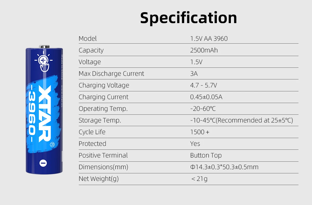 Xtar 1.5V AA 3960 Rechargeable Li-ion Battery