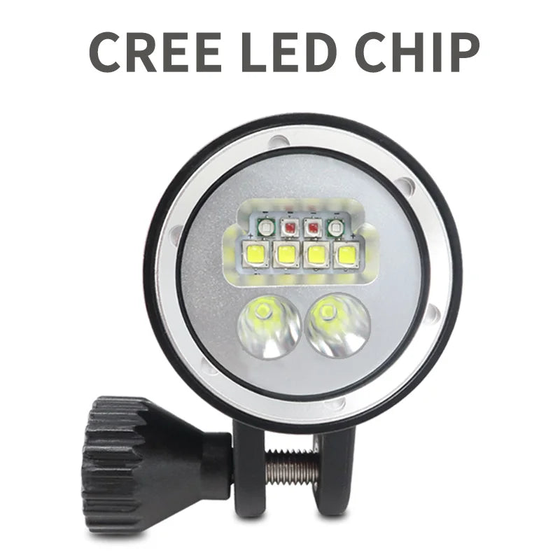 The ARCHON D35VP II is equipped with a variety of high-performance LEDs to provide multiple lighting options. The light features four CREE XM-L2 LEDs with a color temperature range of 4800K to 5200K for white fill light, two CREE XP-E LEDs emitting at 620 nm for red light, two UV LEDs with a wavelength of 395 nm, and two CREE XP-G2 LEDs with a color temperature of 6500K for spotlight. This combination of LEDs ensures that divers can achieve the perfect lighting for any underwater scenario, whether it’s illuminating wide areas, highlighting specific objects, or enhancing the natural colors of marine life.