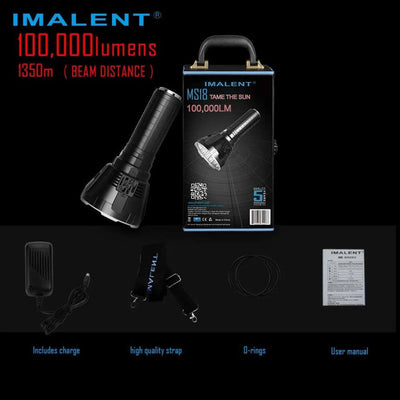 Imalent MS18W: the most powerful portable flashlight in the world. This is the first flashlight to have an incredible output of 100,000 lumens. The Imalent MS18W is equipped with 18 second generation CREE XHP70.2 American LEDs, which produce a beam capable of reaching 1350 meters. The beam of the Imalent MS18W has a color temperature of 5000K and differs from that of its sister Imalent MS18 which instead has a colder tint of about 6500K.