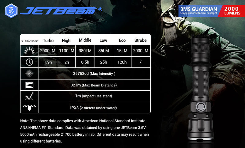The Jetbeam 3MS Guardian is a tactical flashlight in the 21700 format capable of delivering 2000 lumens on the Turbo output level. This flashlight uses a very high efficiency Luminus SST-70 LED and thanks to the combination with the high efficiency digital circuit it allows to have a constant output even when the cell voltage decreases. The maximum range reached is 321m which corresponds to a maximum brightness of 25,762 candelas. This flashlight has a particularly compact design and is very comfortable to hold. The dimensions are: 155.1 mm in length, 37 mm in the diameter of the head, 27 mm in the diameter of the tail, while the weight is 136 grams excluding the battery.