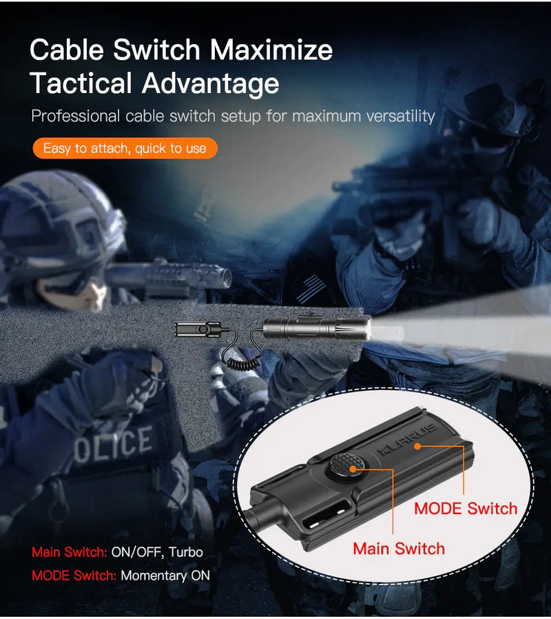 The Klarus GL4 is a tactical flashlight born to be mounted on a weapon. Its dimensions are 139.7mm long by 38.2mm body diameter by 46.3mm head diameter. This flashlight mounts a Luminus SST-70-WCS-H50 LB (BA) (6500K) LED capable of delivering 3300 lumens to the Turbo. Power is supplied by a single 21700 cell included in the package to charge an internal battery. use the type-C charging interface on the flashlight. A full charge cycle takes four hours. The maximum charge current is 5 volts 2 amps. The package is rich and includes, in addition to the flashlight, also a 21700 500 milliamp battery, a charging cable, an o-ring, a remote switch, a picatinny rail adapter, a user manual, a hex wrench and two screws. The output levels are six and are divided as follows: Turbo of 3300 lumens with a runtime of four hours and a maximum light intensity of 32,240 candles corresponding to 370 M, maximum distance reachable, Alto from 1200 lumens with 7 hours of Runtime 10000 candles and 200 m, Medium of 200 lumens, a runtime of 13.5 hours 1600 candles and 80 m of maximum reachable distance low of 10 lumens, 375 hours 100 candles of maximum light intensity and 20 m of maximum reachable distance, A 3300 lumens strobe level and 150 lumens SOS level. Between water resistance and date according to the IPX-8 standard, while the impact resistance is given up to 1.5 m in height. The flashlight is equipped with a picatinny rail adapter to be mounted on weapons that adopt the same system. The intelligent temperature control keeps the temperature and the light between 45-50 ° C. There is the memorization mode of the last level used when using the flashlight in outdoor setting. Inside the battery compartment there are two springs on the positive side and on the negative side which reduce the shocks to the battery. The flashlight has a capacity indicator that stays lit for 5 seconds to indicate the remaining capacity of the cell when the light is turned on.If the indicator lights up green, it means that the capacity of the cell is between 70% and 100%, if instead it lights up orange it means that the cell capacity is between 30% and 70%, while when it lights up red it means that the cell capacity is less than 30%. the package also comes with a Tactical Rail Clamp and a remote switch.The remote switch has two buttons, a main switch is a mod switch, exactly like those present on the tail of the flashlight. ). By keeping the switch mode pressed, it is possible to access the turbo, while when the switch is released the light goes out.The user interface has two different modes, the tactical one and the outdoor one.The user can choose between these two modes according to suit your needs. What changes between the two modes is direct access to the low and turbo strobe functions.