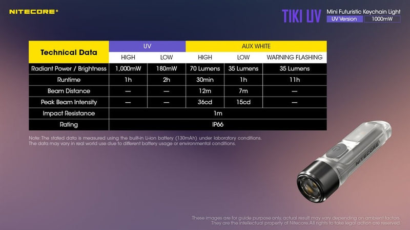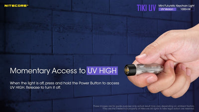 The Nitecore TIKI UV 1000 Rechargeable UV Keychain Flashlight is an impressive addition to your everyday carry essentials. With its compact size, powerful UV capabilities, high CRI white light, ultralow drain technology, and rechargeable battery, it is designed to meet the needs of modern life, offering both versatility and reliability. Whether you're examining documents, exploring the great outdoors, or simply in need of a dependable light source, the TIKI UV 1000 is a compact powerhouse you can trust to deliver