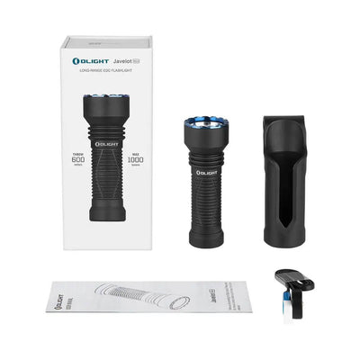 The Olight Javelot Mini is a torch for daily long-range EDC use, with extremely compact dimensions and capable of reaching 600 meters of maximum range with a maximum output of 1000 lumens. This torch can be powered with a single rechargeable lithium ion cell model 18500 supplied with 2040mAH. The maximum runtime is 4 hours and 57 minutes when using it on the lowest output level. The rear side of the flashlight, the tail, follows the Olight two-in-one design: the functions of the tail are in fact two and very distinct. there is the possibility of using the tail as a charging interface via Olight's custom USB cables and there is also the possibility of using the switch present with the thumb for quick access to the functionality of the flashlight.The body of the Olight Javelot Mini is made in aeronautical aluminum alloy and is resistant to falls up to 1.5 meters in height while the degree of waterproofing is given as IPX8 therefore submersible torch up to two meters deep without suffering any damage. Near the head there are deep dissipation fins that help in the dispersion of the heat produced when using the flashlight on high levels. In the central part of the body there is an abundant knurling that makes the torch grip safer and more comfortable. The tactical switch with soft design is double-stroke: a short press activates the Low mode and a full press activates the High mode. The Bezel is toothed and effectively protects the lens from blows or falls, and can also be used as a glass breaker if necessary. The Olight Javelot Mini is available for purchase in two different colors: Black and Military Green. The olight Javelot Mini is one of the first Olight torches to use as a round LED light source that provides a more balanced and homogeneous light beam. The special tail cover is flat but at the same time concave to provide a more comfortable interface for using the thumb and to allow the flashlight to be fixed very firmly on magnetic surfaces using the magnet present. Among the accessories supplied there is a holster with a new design designed to be used in various ways: it can be attached to the belt, to the service belt, to the backpack strap to the pocket and more. The interface also features a low battery warning by vibrating: a small internal motor will vibrate to alert the user that it is time to change the battery. If the cell capacity is below 0% then the flashlight will vibrate once every 5 minutes, if the capacity is below 10% the flashlight will vibrate twice per minute if below 5% it will vibrate 3 times every 10 seconds. The output levels are divided as follows: High (1,000 ~ 500 ~ 200 lumens with duration 6.5 + 78 + 19 minutes), Low (200 lumens with duration 297 minutes) while there are no Strobe or SOS. The dimensions are 32 mm (1.26 in) Body Diameter, 40 mm (1.57 in) Head Diameter, 115 mm (4.53 in) Length while the weight is 154 g (5.43 oz).