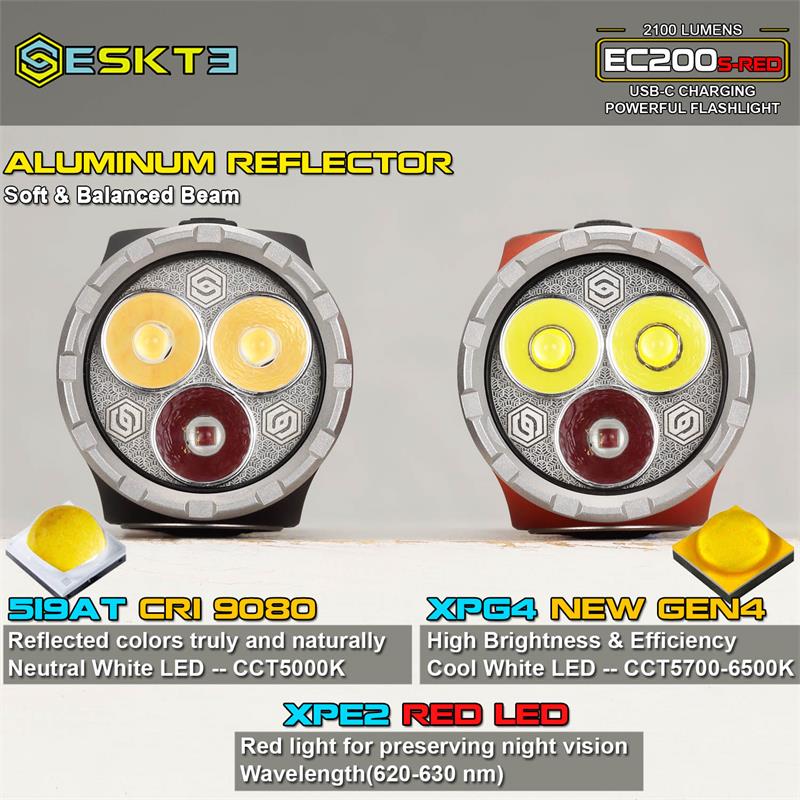 Featuring a combination of CREE XP-G4 Cool White and Nichia 519A Neutral White LEDs, along with an XPE-2 RED LED, the EC200S-RED delivers a maximum output of 2100 lumens for the white beam and 320 lumens for the red beam. This dual-channel configuration provides users with flexibility in choosing the appropriate lighting for different situations, whether it's preserving night vision, signaling, or illuminating dark environments.