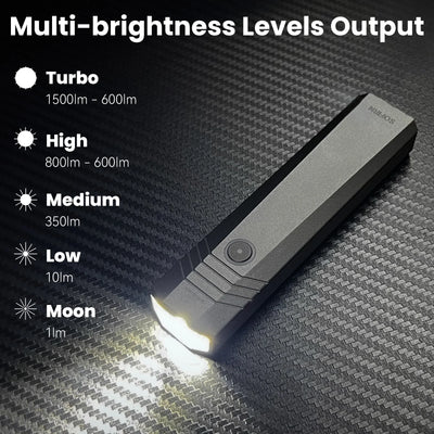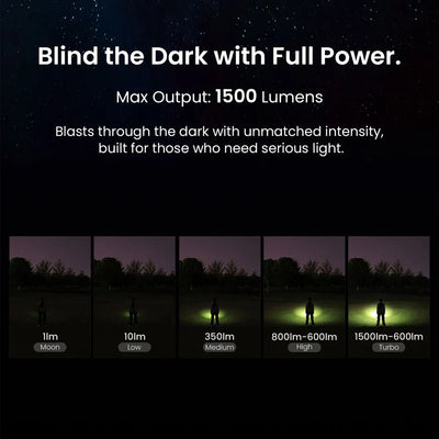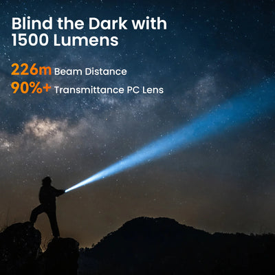 2. Powerful Enough: Equipped with throw and flood LEDs, delivering up to 1500 lumens and a beam distance of 226 m. Ideal for camping, hiking, and outdoor adventures.