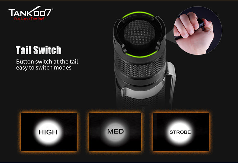 This TANK007 K9 uses a Cree XM-L2 (U2) LED, lifespan up to 100,000 hours. The maximum output level is 700 lumens and the maximum reachable distance is 200 meters. The input voltage can range from 3.0v to 12v so the light can be powered by 1*18650 / 2*16340 / 2* CR123. The user interface has three modes of use: High level with a three hour runtime, medium level with a 10 hour runtime and a flashing stroboscopic level.