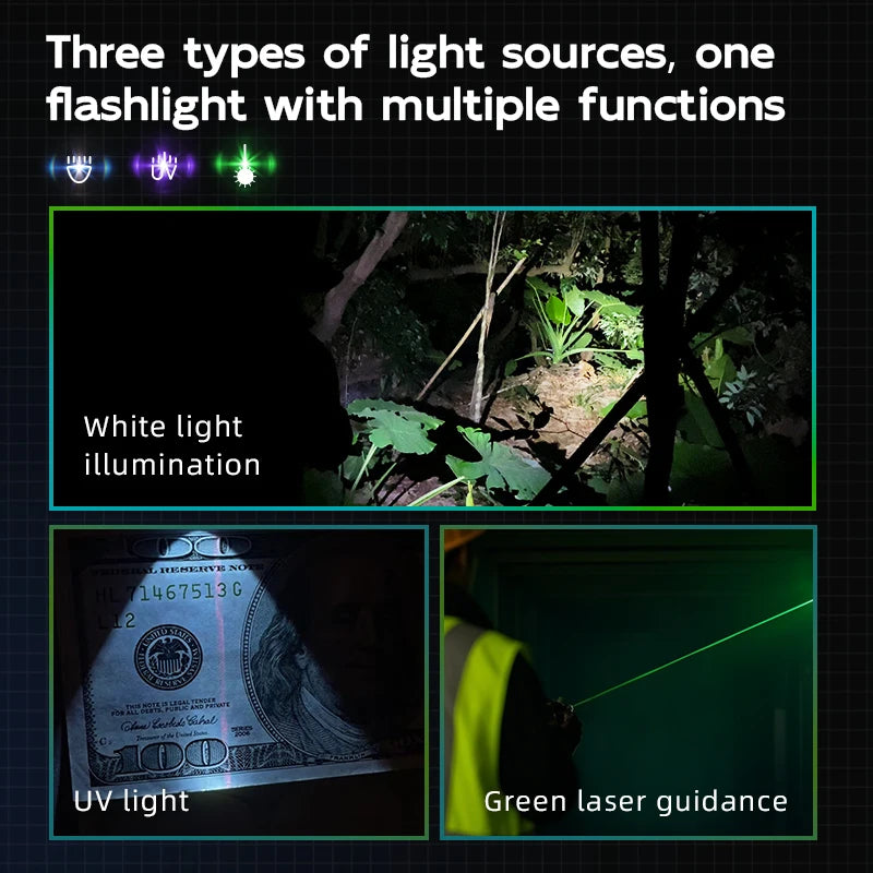 The flashlight includes two separate light sources: a forward-facing main beam and a side-mounted secondary beam. The front light, situated within a robust rectangular housing, consists of dual LEDs designed for powerful, long-range illumination. The side light, embedded into the flat body of the unit, provides a broader and more diffuse beam, ideal for area lighting or up-close tasks. This dual-beam configuration allows the user to switch between focused visibility and wide-area illumination depending on the context. Clearly marked dual control buttons on the side of the flashlight offer independent activation for the two light sources, ensuring intuitive operation even in dark or high-stress environments.Charging and power management have been thoughtfully integrated. A USB-C charging port is located under a sealed rubber flap on the side of the flashlight, suggesting water and dust resistance suitable for rugged use. The presence of a USB-C interface also indicates a modern and efficient recharging process, likely supporting faster charging times compared to older micro-USB models. The flashlight seems to include built-in battery protection, as implied by the solid construction and reinforced terminal design. Along the rear, a strong integrated clip allows for attachment to belts, straps, or pockets, making the flashlight exceptionally practical for hands-free use during work or outdoor activity.
