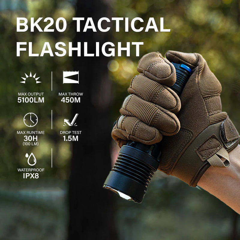 The BK20 is designed with durability and reliability in mind. Constructed from aerospace-grade aluminum with a hard-anodized anti-wear surface treatment, this flashlight is built to withstand the rigors of heavy use and harsh conditions. The stainless steel attack head is inlaid with three silicon nitride ceramic beads, adding a layer of functionality for emergency situations or self-defense. The flashlight also features a robust IPX-8 waterproof rating, ensuring reliable operation in wet and rainy environments. Whether youâre traversing a rain-soaked trail or performing water-based operations, the BK20 is built to perform under pressure.