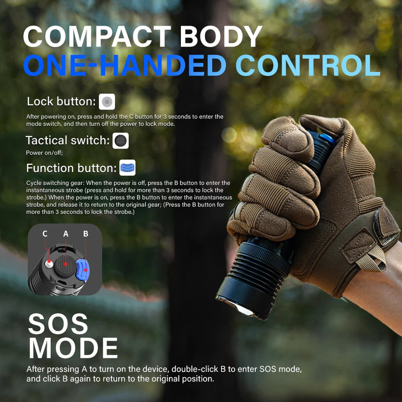 A standout feature of the BK20 is its tail-cap design, which incorporates a three-button layout for intuitive and efficient operation. This setup allows for quick access to various functions, including one-key locking to prevent accidental activation. The locking mechanism is especially useful for ensuring the flashlight doesnât inadvertently turn on during transport or storage, conserving battery life and preventing unwanted use. The tail buttons are designed for easy access, even while wearing gloves, making the BK20 a practical choice for tactical and outdoor applications.