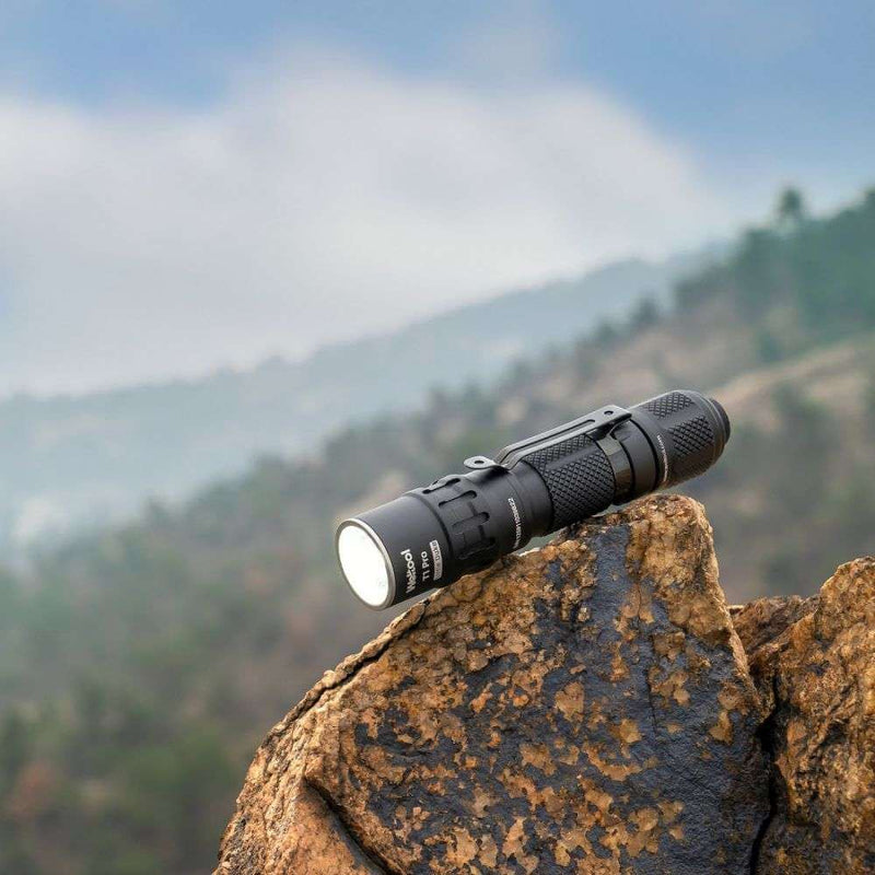 The construction of the T1Pro V3 is built for durability, using precision CNC-machined aluminum alloy with a hard anodized finish for superior strength and wear resistance. The tempered glass lens with an anti-reflective coating enhances light transmission while providing excellent durability. The flashlight is further reinforced with a stainless steel sandblasted bezel, ensuring protection against impacts and rough handling. The high-density X-LED and aluminum alloy reflector work together to produce a focused yet wide beam pattern for optimal illumination in various environments.