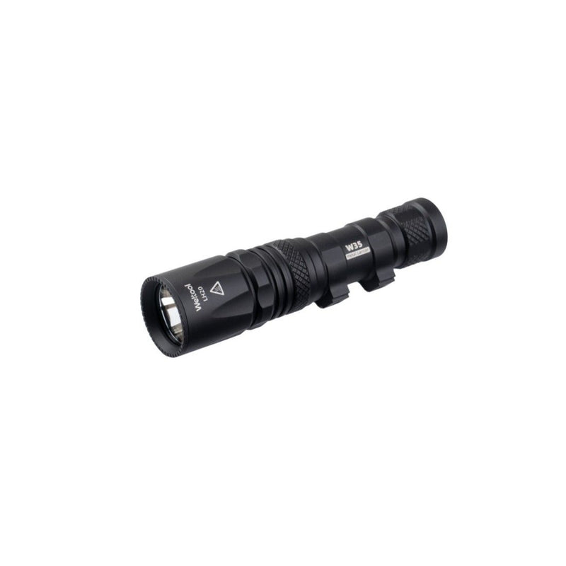 The Weltool W35S Compact LEP Weapon Light with spill is a remarkable piece of technology designed for long-range illumination. This compact weapon light, powered by a high-drain 18350 lithium-ion battery, boasts an impressive beam intensity of 364,500 candela and a throw distance of 1,207 meters, making it ideal for tactical applications. With a light output of 700 lumens, it utilizes a custom LEP light source and an aluminum reflector to optimize the traditional narrow LEP beam into one with a spill. This low lux spill is beneficial for retaining dark adaptation and situational awareness while maintaining high candela. The light source complies with IEC 62471 Exempt and IEC 60825 Class 1 standards, ensuring safety and reliability.