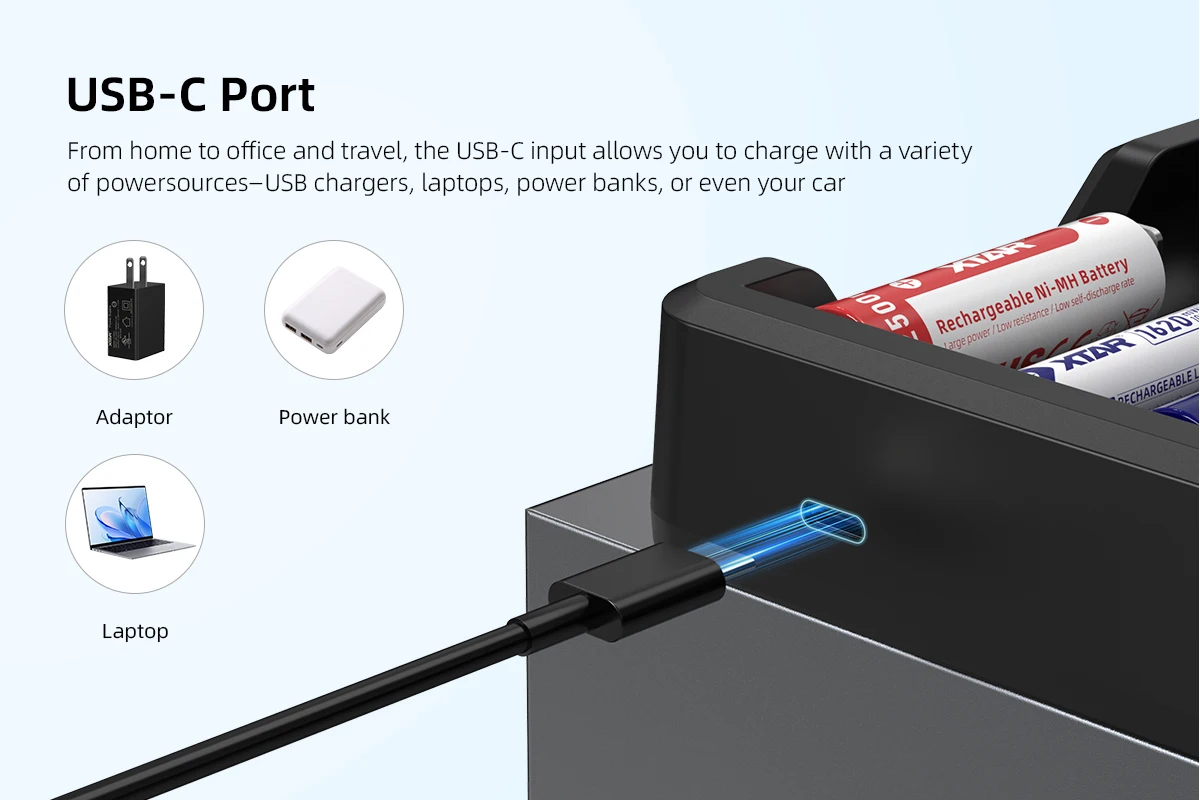 Supports AA/AAA specifications including 1.5V Li-ion batteries, 1.2V Ni-MH batteries, and 3.6/3.7V Li-ion batteries, providing a one-stop power supply solution for your various device needs.