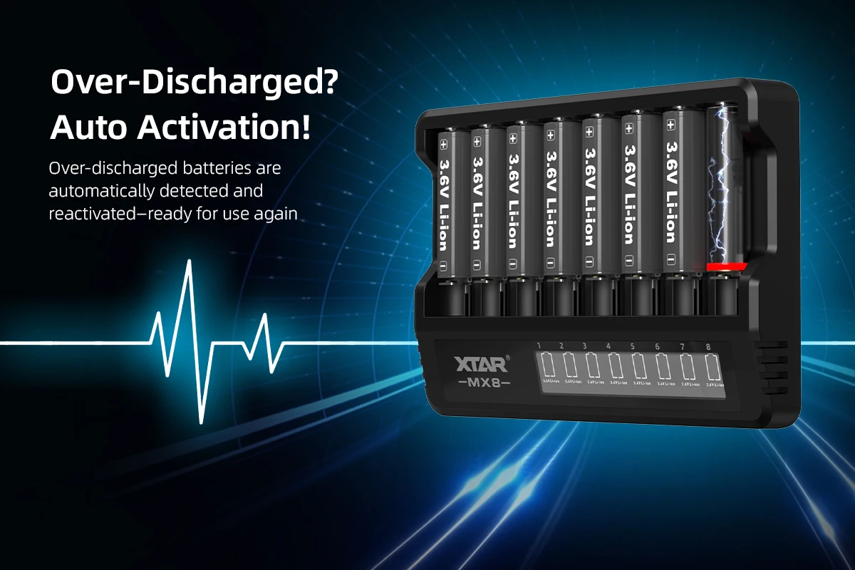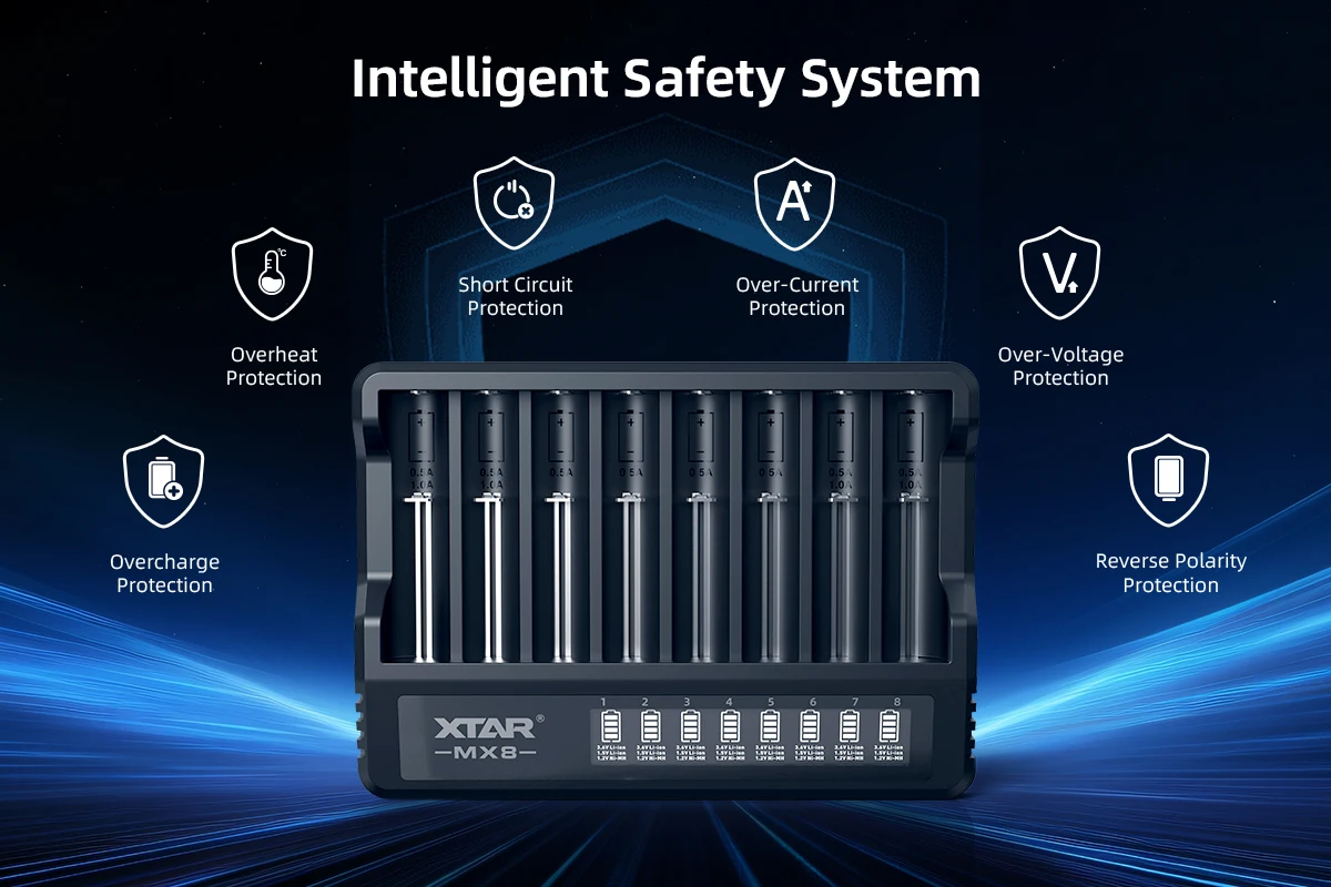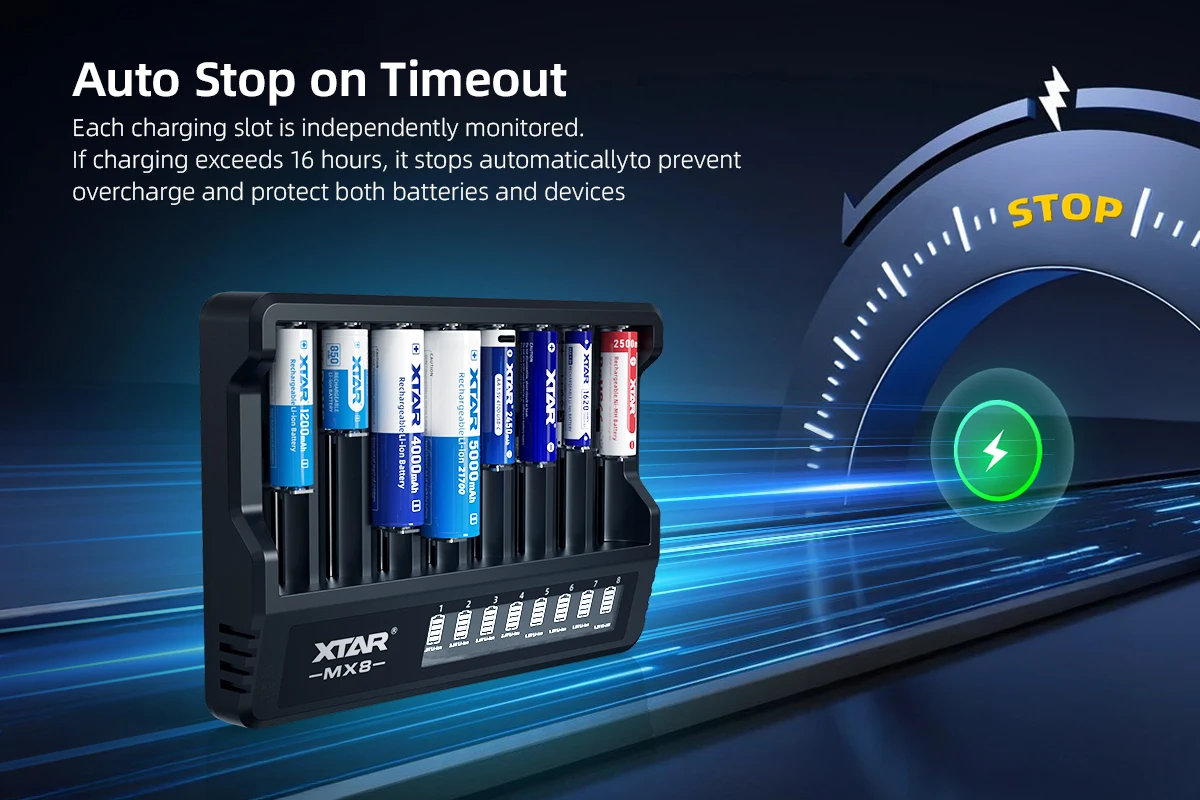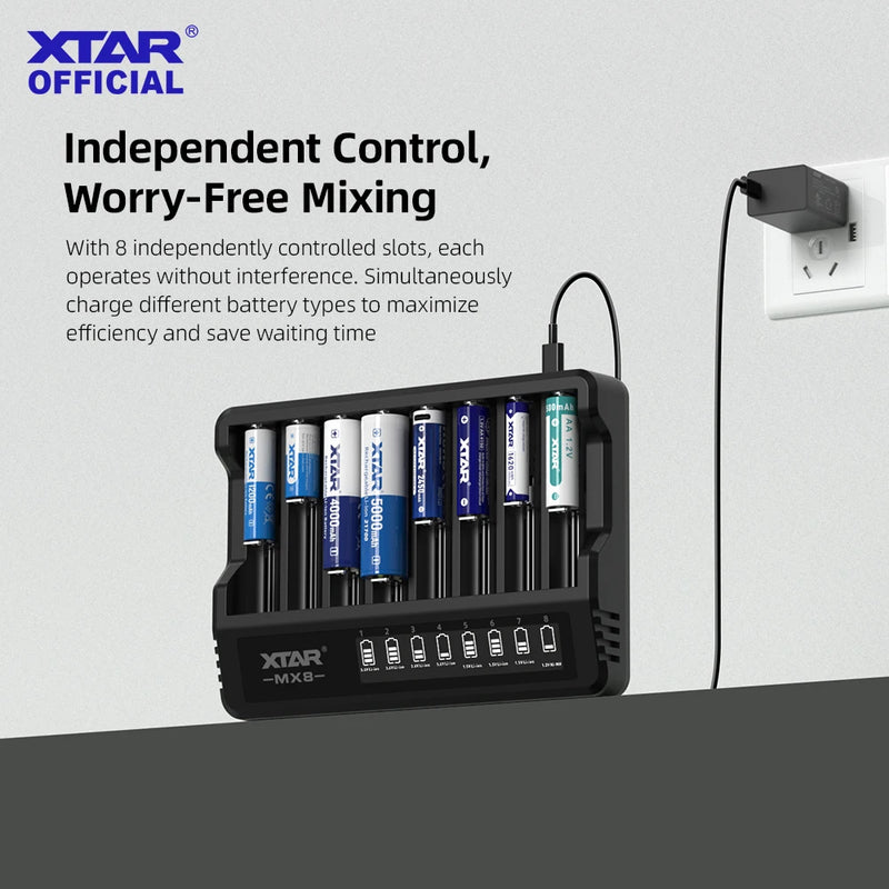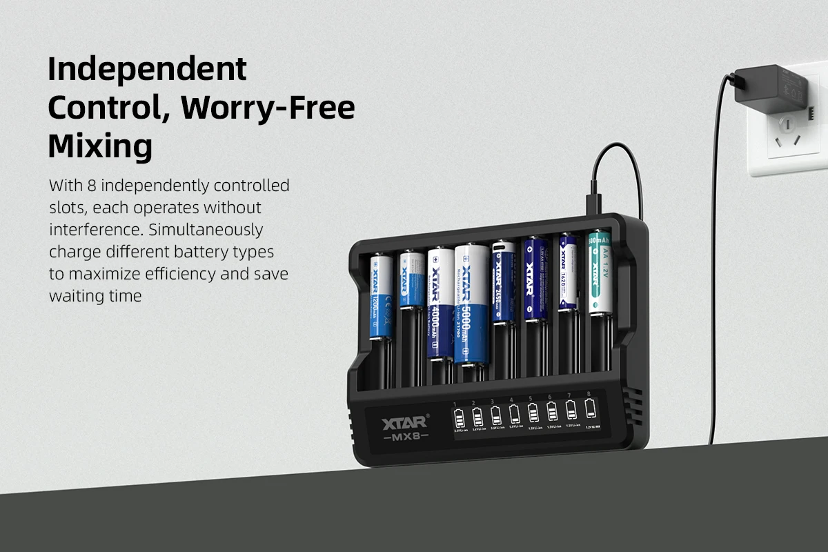 Eight charging slots are completely independently controlled, allowing simultaneous hybrid charging of different types and specifications of batteries without interference, doubling charging efficiency.
