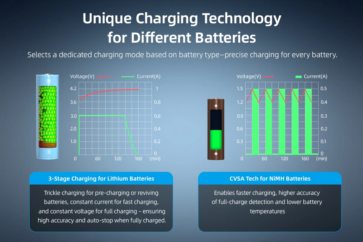 Built-in smart recognition chip, automatically matching the optimal charging mode; unique 0V battery activation function, capable of attempting to recover over-discharged "dead" batteries.